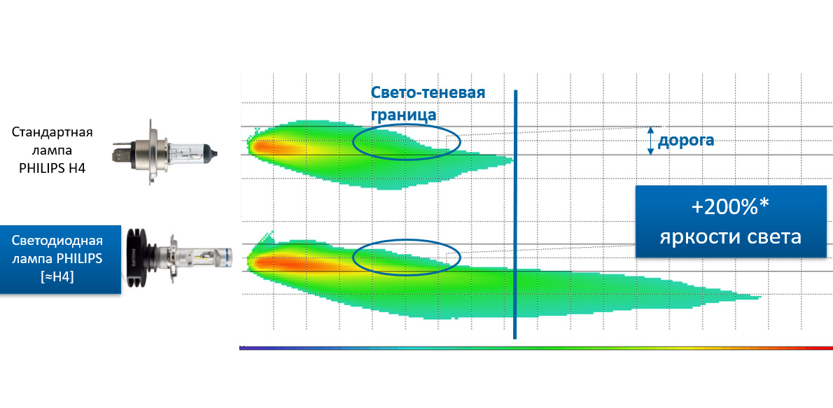 *Данные показатели были определены путём сравнения светодиодных ламп с галогенными аналогами с минимально разрешёнными характеристиками и могут меняться в зависимости от конструкции конкретных фар.